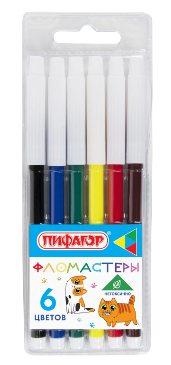—Фломастеры ПИФАГОР, "ВЕСЕЛЫЕ ПИТОМЦЫ", 6 цветов, невентилируемый колпачок, 152451