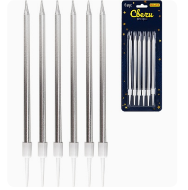 Свечи для торта на подставках Яркий праздник, 0.4х10,5 + 3см, 6шт, серебристые, С-2035