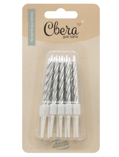 —Свечи Спирали, Серебро, Металлик, 0,5х5 + 2 см, 10 шт. с держателем, 802970