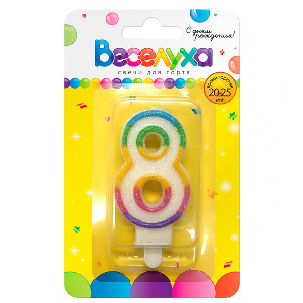 —Свеча для торта 'Цифра 8. Разноцветный градиент' с глиттером, картон. уп., европодвес,620086-8